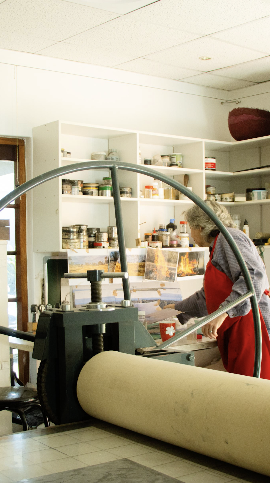An additional thread running through her visual and practice based research is the notion of co-creation. As a printmaker, collaboration is integral to the process which informs activism. This is evident in the various campaigns and community engagement interventions she has founded including Phumani Paper, a government funded project establishing 20 poverty alleviation projects across the country; The Paper Prayers and HIV/Aids Awareness campaign: and more recently was one of the co-founders of ‘The Lockdown Collection”, an artist-led project raising over R3.5million for over 500 vulnerable artist grants and art student bursaries. Together with Art therapy specialists in the field, she has established the first academic qualification in a Masters of Art Therapy at the University of Johannesburg. She is an active printmaker and her art works are included in international and local collections, including the Museum of Modern Art in NY, The Smithsonian Institute in Washington, Wits Art Museum and others.