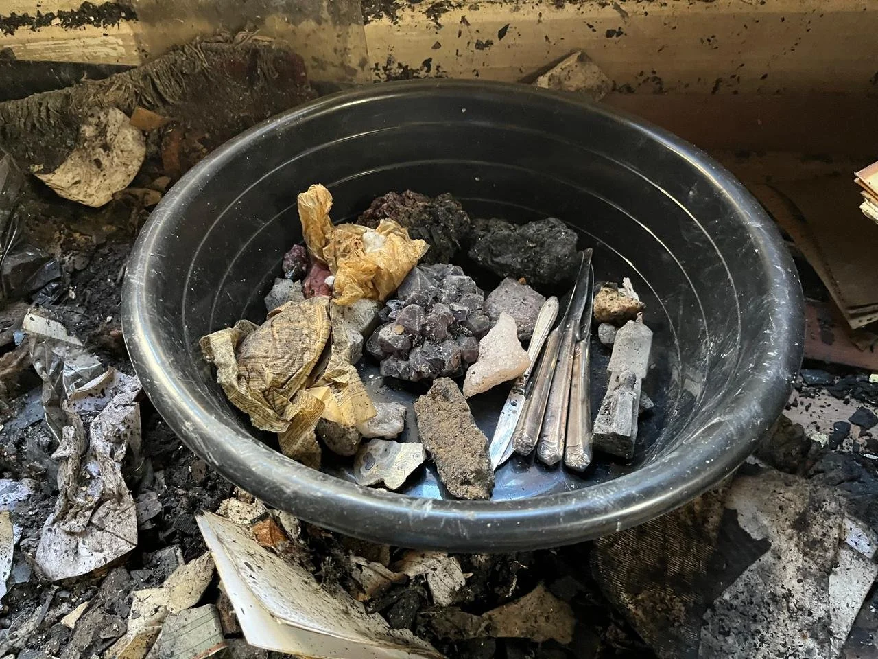 The devastating home fire on 8th June 2025 destroyed, yet ironically revealed, an artistic treasure trove. Journals, archives, artist’s books, and a geological rock collection were excavated by sifting through the remains to find parts of the self that could be repurposed, reimagined, and recreated. This process approximates the act of ‘ground truthing’, usually amassed remotely from satellites or aerial surveys, to observe, collect, and sense data on the ground to ensure the accuracy and reliability of real-world conditions. Kim’s process, however, was a physical engagement in close proximity with the live material, touching and digging through ashes and remains. It became a psychological and analytical pursuit of the excavation of buried, repressed, hidden fragments of memory carefully stored in the unconscious crevices of cupboards and drawers. The feeling states resurface. The nostalgia of past relationships, resurfaced grief for loved ones that have died, pride in projects manifested, all are revealed in traces of evidence - burnt.