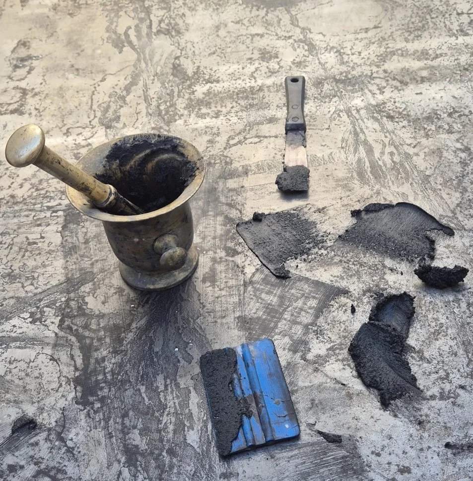 (Left) Making the base sheet; (Centre) Ghana-kozo fibre; (Right)Grinding ash pigment.