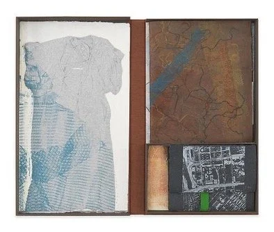 RE— Tale of Two Cities, 2022/23, Varied edition of 10; Drypoint, etching, monoprint, digital, silkscreen, and collage on Dobbin Mill papers with embedded detritus, clothing, plastic mesh and packaging materials (https://www.robbinamisilverberg.com/re)