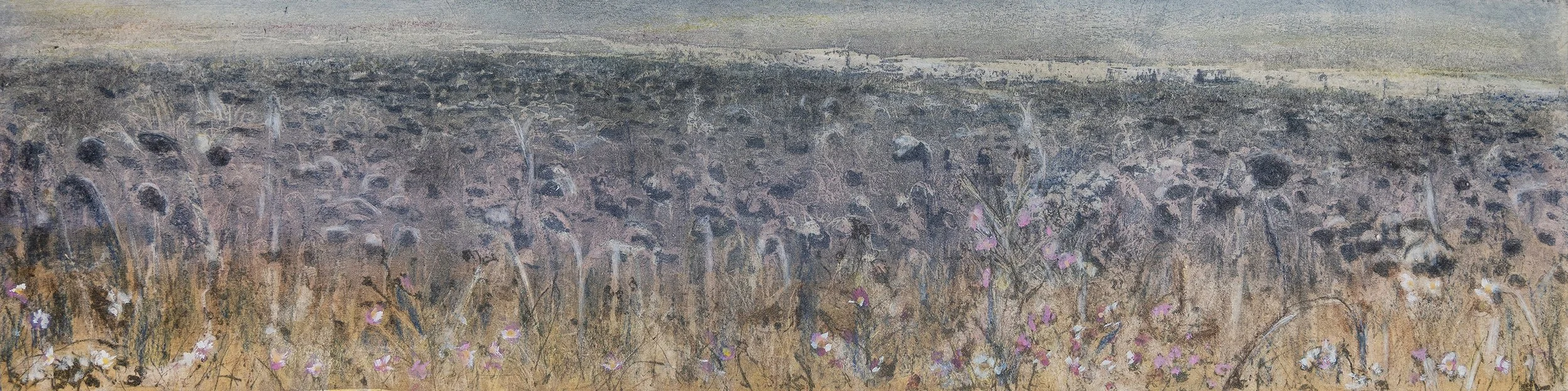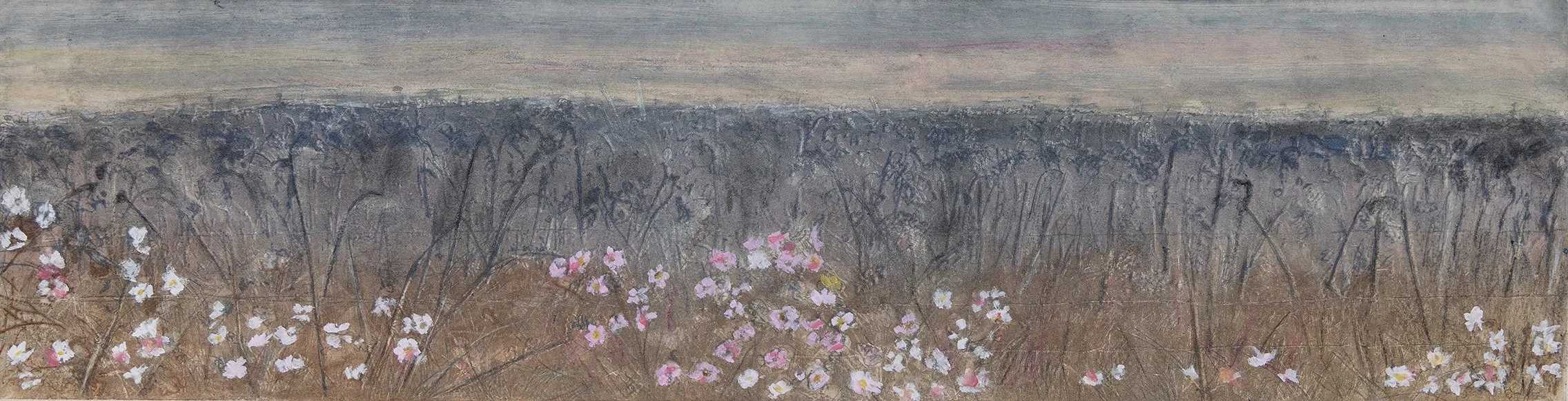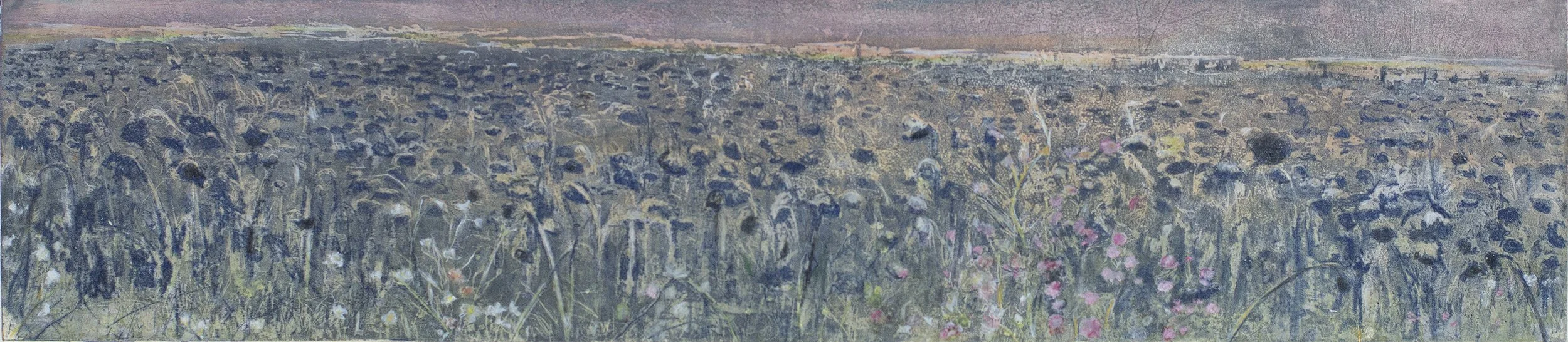 Characteristically, Berman’s work grows in spirals. Her ideas are allowed to morph into one another, bridging long stretches of time in which she isn’t physically making work, but lecturing. A cycle turns, a teaching sabbatical shifts into place and the etching plate has become a vessel for a monotype, the field of bereft and furious women has shifted to look like one of flowers; the sunflowers are threaded through with cosmos.