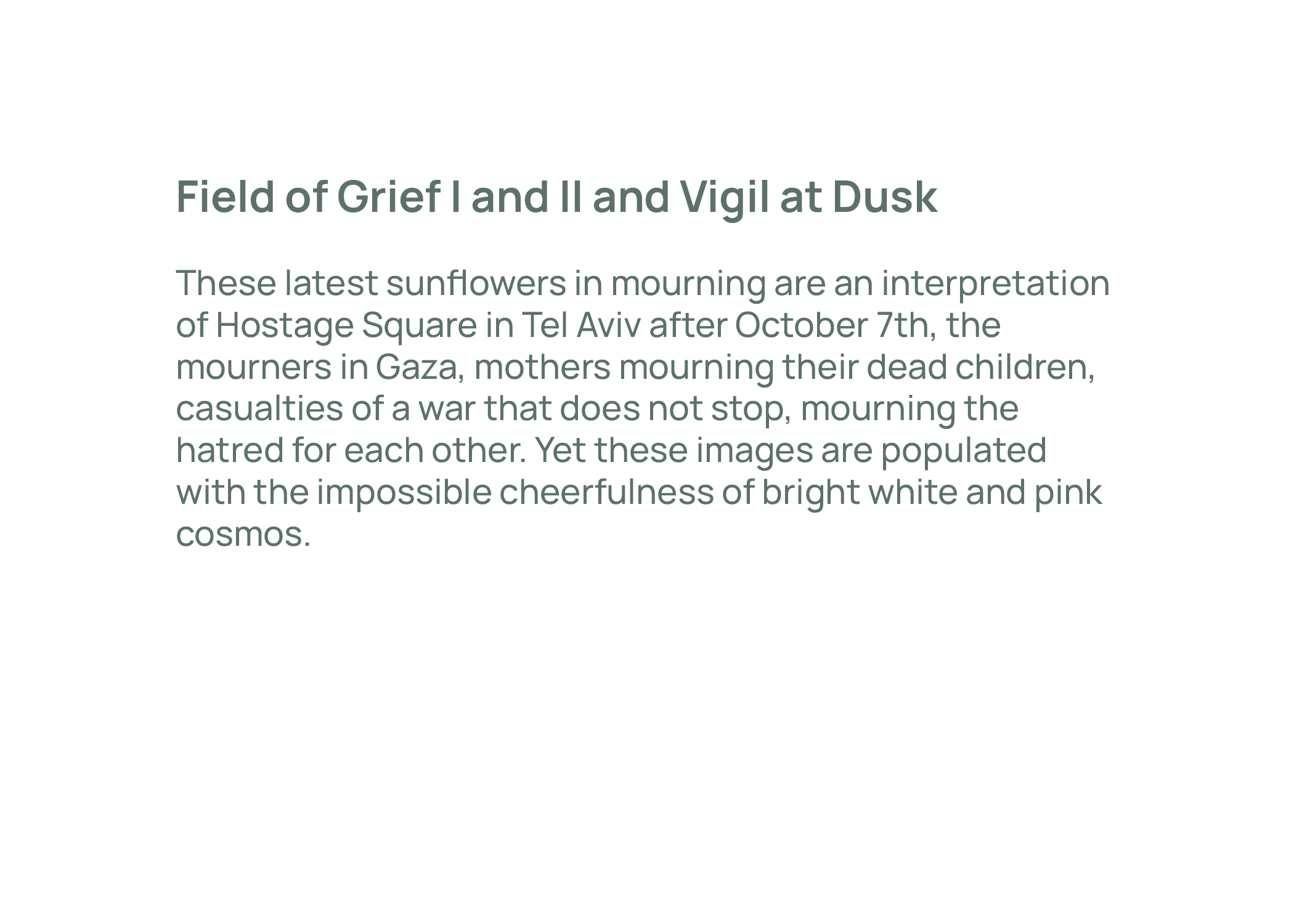 Like tombstones from afar, or a crowd of people frozen in time, Berman’s sunflowers become ciphers to a turning world, bruised and battered though it may be with fake news, destructive political agendas, bare-faced lies and massacres of innocents.