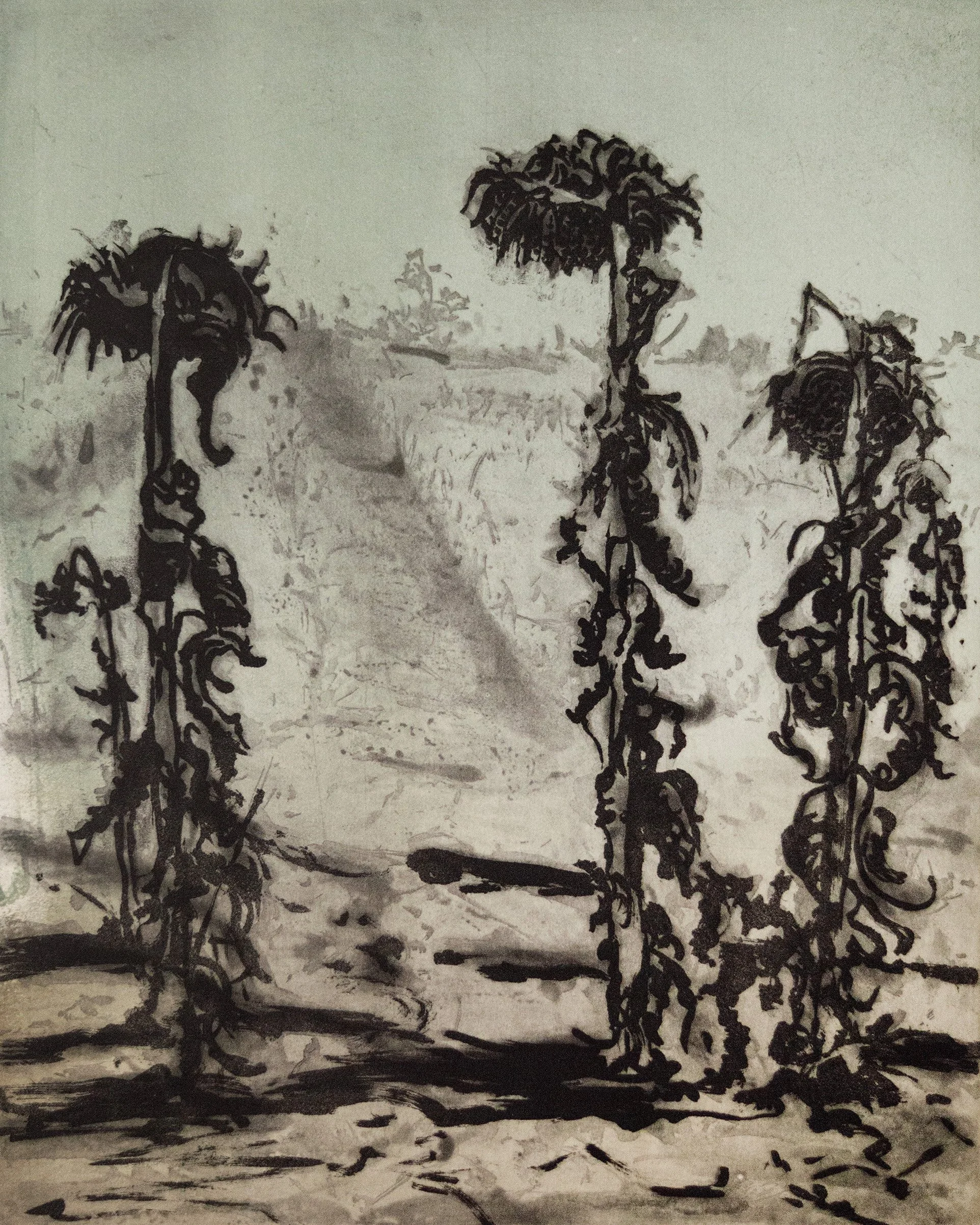 On Berman’s etching plates, the sunflower does something else. It exists in a political space where there is no sun to follow, and it droops its head in sadness. This oxymoron has become a metaphor that threads through an earnest and focused career which has been as much about empowerment and giving back as it has been about the collective energy of a printmaking studio. It’s been witness to atrocities and fire, to rebirth and reconstitution. The sunflower in mourning has, in Berman’s oeuvre, become a sub-theme that has always been present but never bolshy or maudlin in its domination of her horizons.