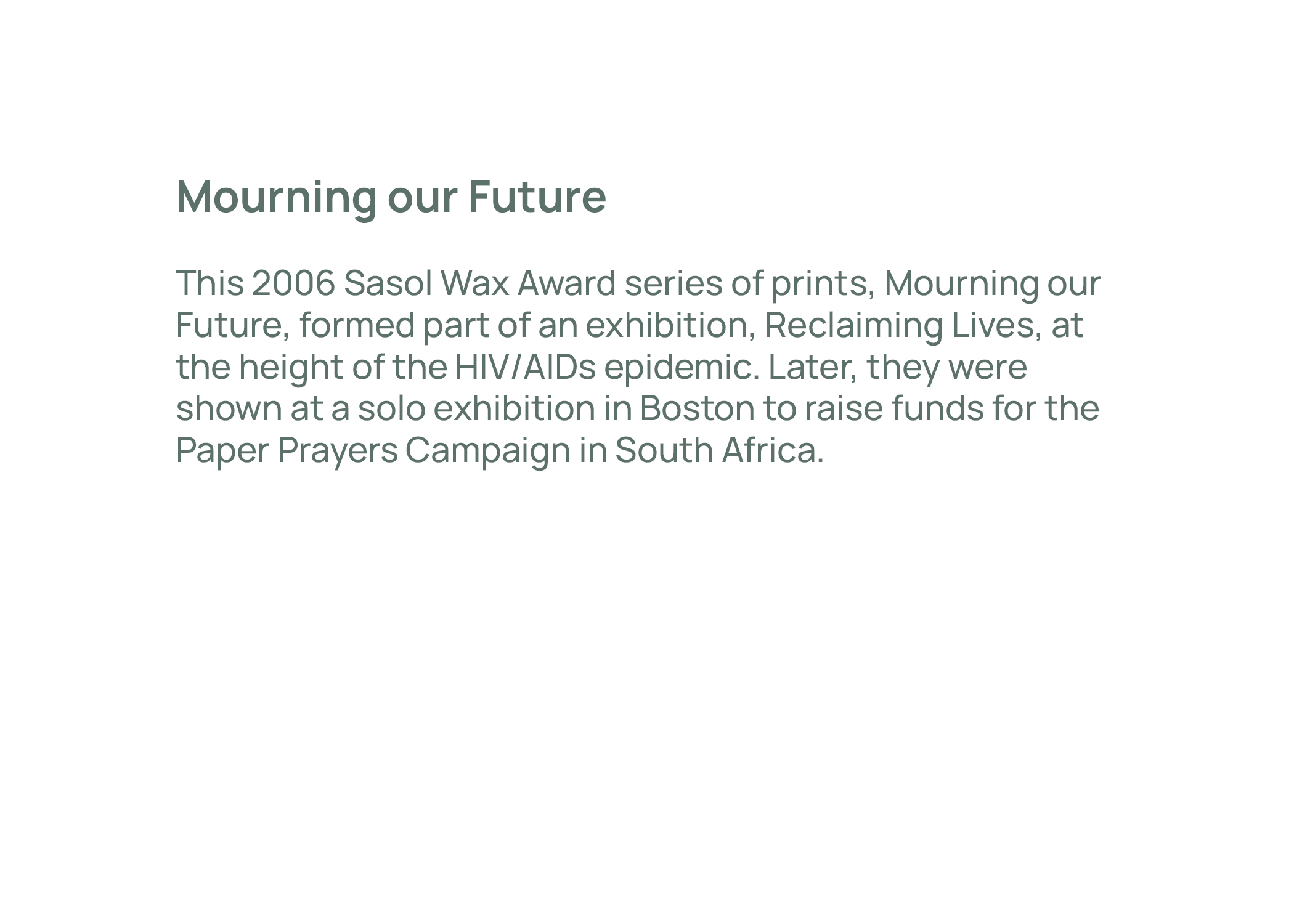 The year I was working on the series Landscapes of the Truth Commission, my cousin Beverly, with whom I grew up, passed away on an operating table from a botched routine surgery. For me, the sunflower fields became symbols for mourners expressing collective grief. And from that time, as an activist travelling across the country offering Paper Prayers workshops in partnership with AIDS educators, sunflowers represented the Mourners and the resilience of the movement. This led to the Sasol Wax project, where I was a finalist, and I used the opportunity to facilitate a communal project that involved 100 tribute portraits by APS members. I hoped that by paying tribute to a person each one of us has lost through AIDS, the contemplative process of etching would promote and hold safe futures and practices for the participants.