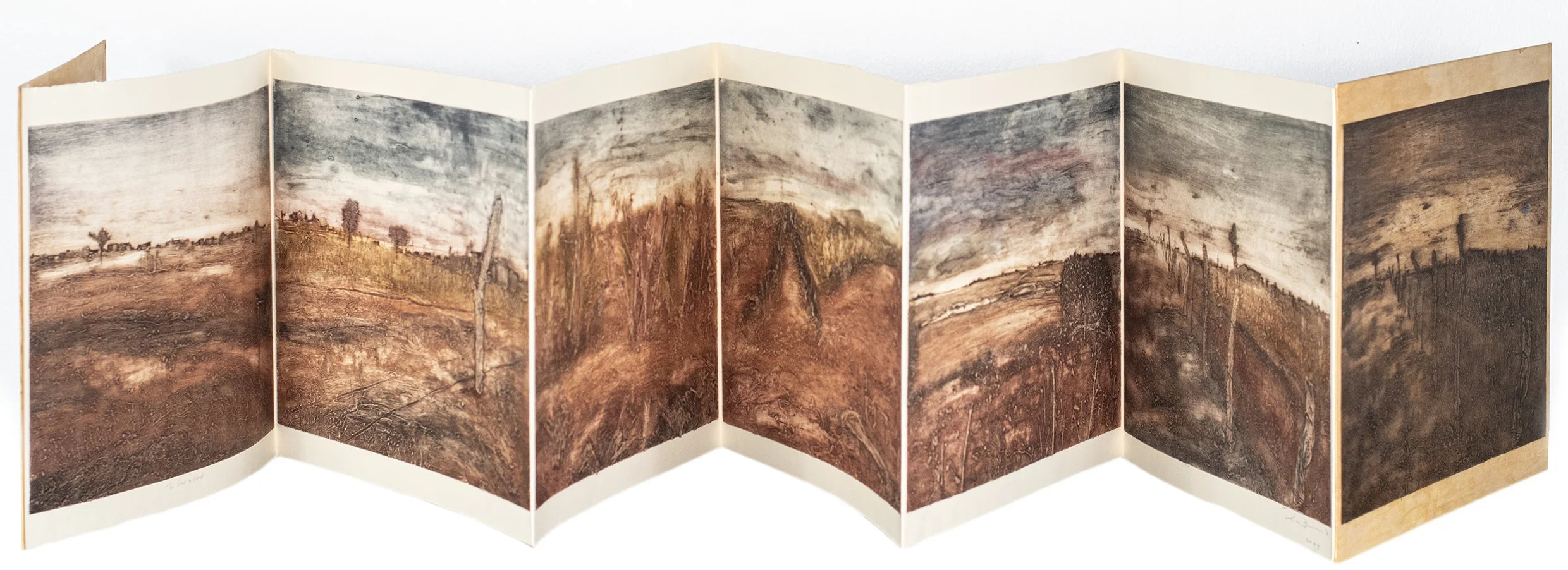 I wanted to contribute some musings from notes I made while relooking at Berman’s earlier prints. First, her beautiful folding leporello,a printed book titled The Road to Huhudi, made in 1993. This work firmly established my appreciation for her deftness and ability to create a landscape that works well over this long-form, concertina format. Kim’s handling of printed colour wiping is impressive - she does not wipe away all the ink from the plate but also moves some ink across the whole work, in a long sweep, continuing the curvature of an horizon line.