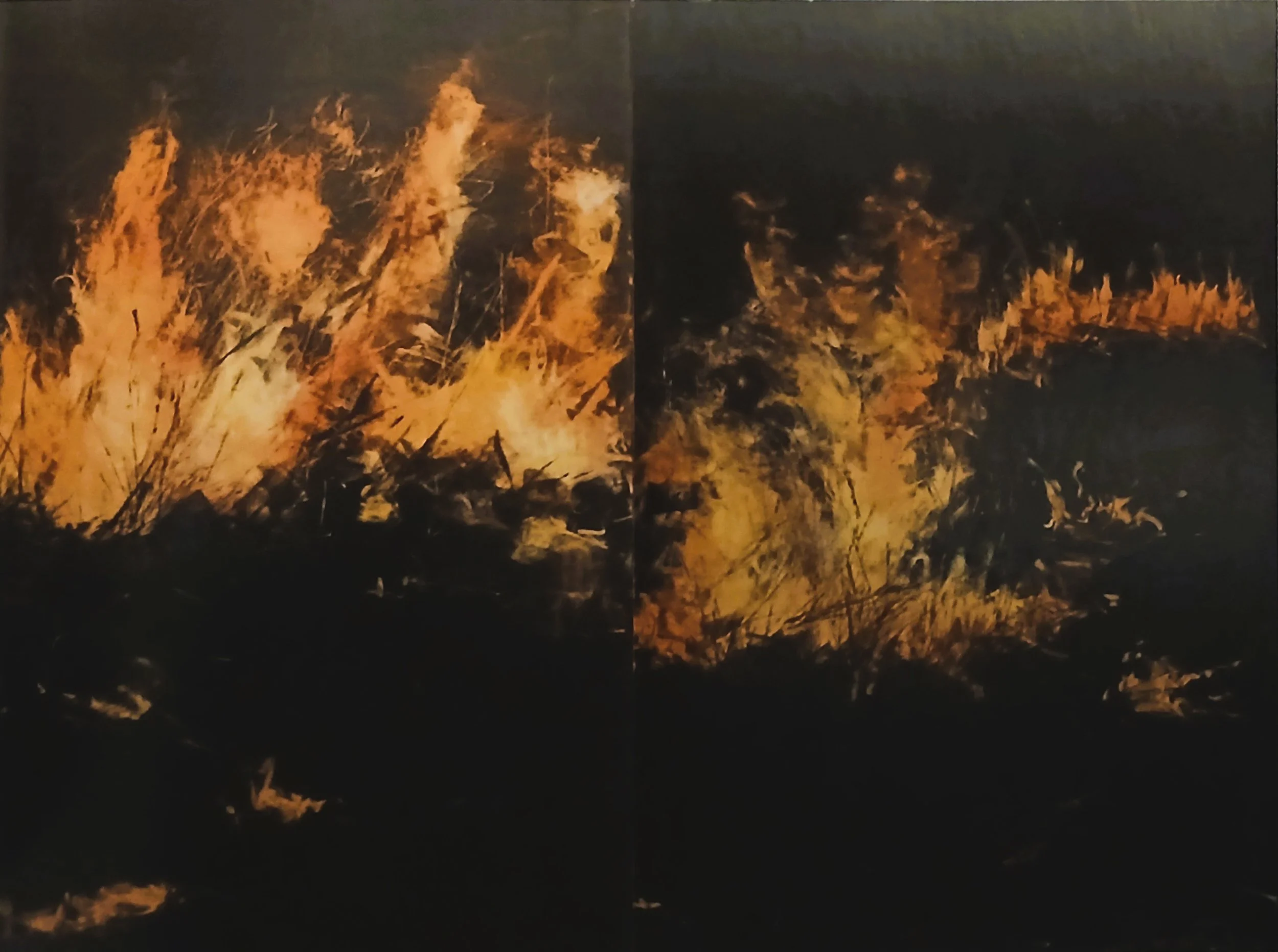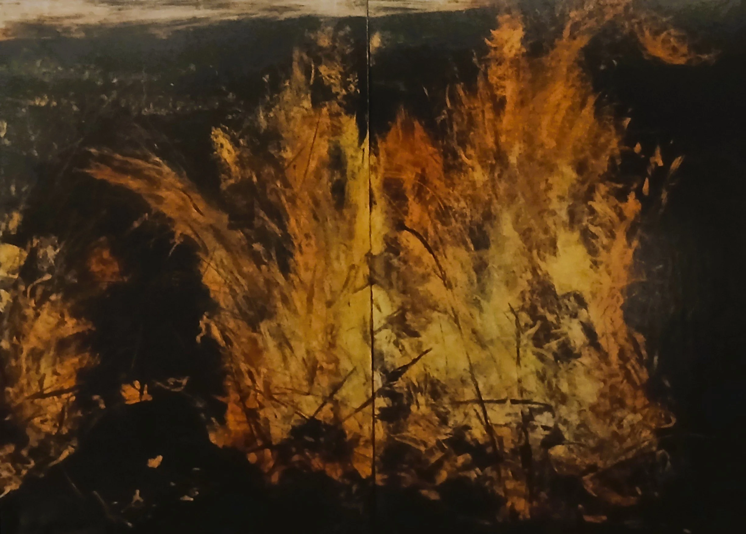 Kim Berman’s use of the landscape made great use of metaphor in motif but always reflects the people. Her Sunflowers in Mourning prints were created during the height of the HIV /AIDS epidemic in South Africa when official policy affected women left behind in rural village areas. A middle generation had passed away in large numbers, with grandmothers left shouldering the responsibility of caring for their grandchildren, while mourning the passing of those who had no access to appropriate care. These prints are mourning and conversely also celebrate the women of those communities - still the backbone of the nation, the resilient carriers of the flag - having waited so long, still looking forward with hope for a new tomorrow. Berman’s next major series leads directly into the idea of scorching fires. The Fires of the Truth Commission became a landmark series.