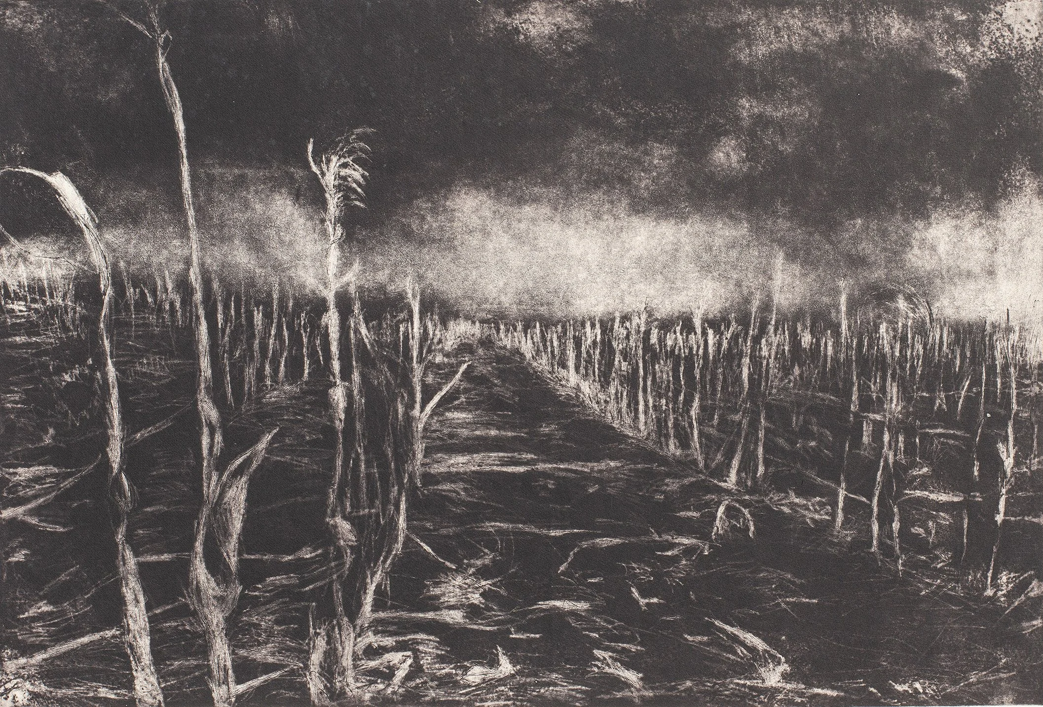 Charcoal stumps near Ventersdorp, 1995, drypoint with surface rolls