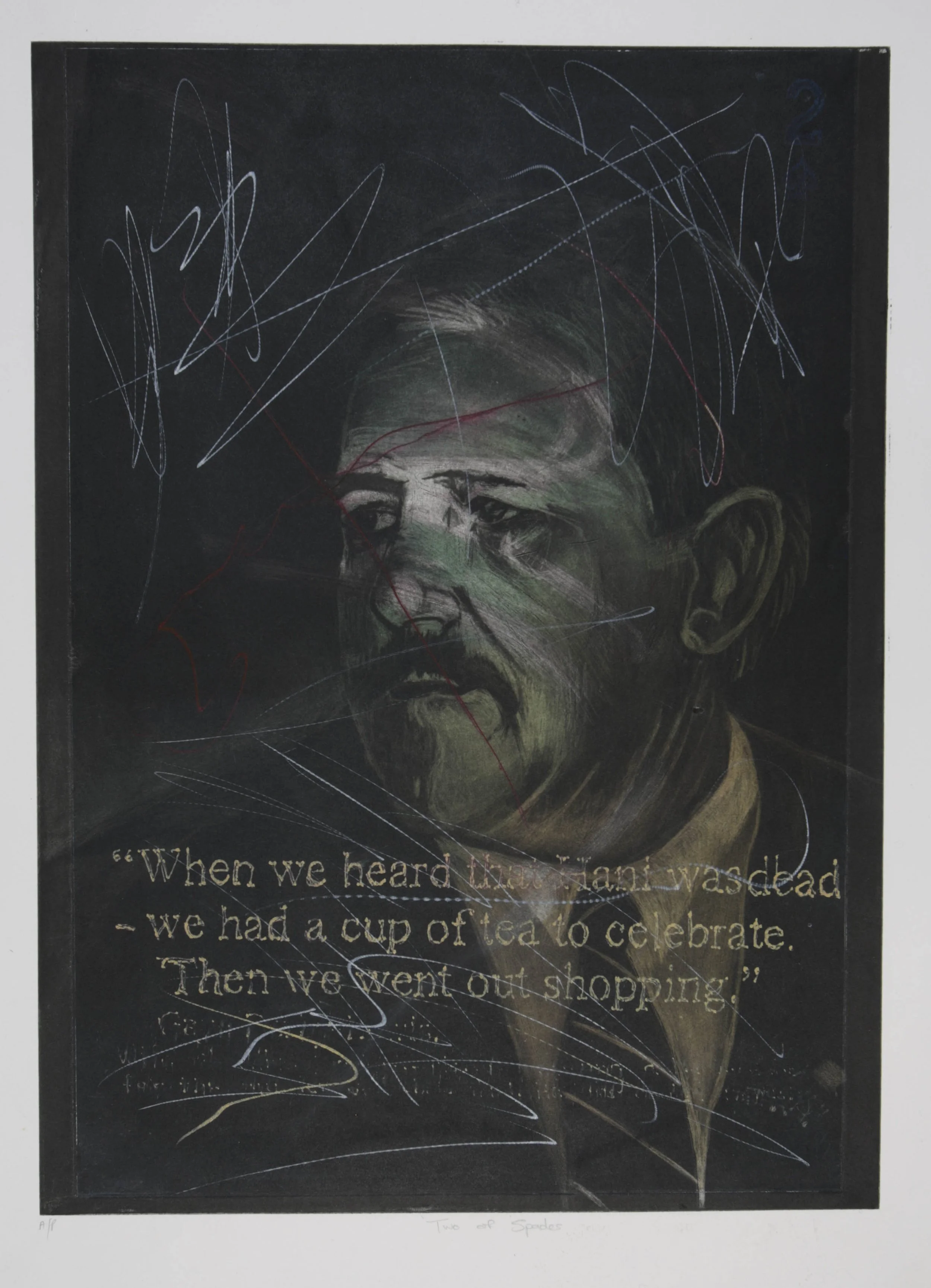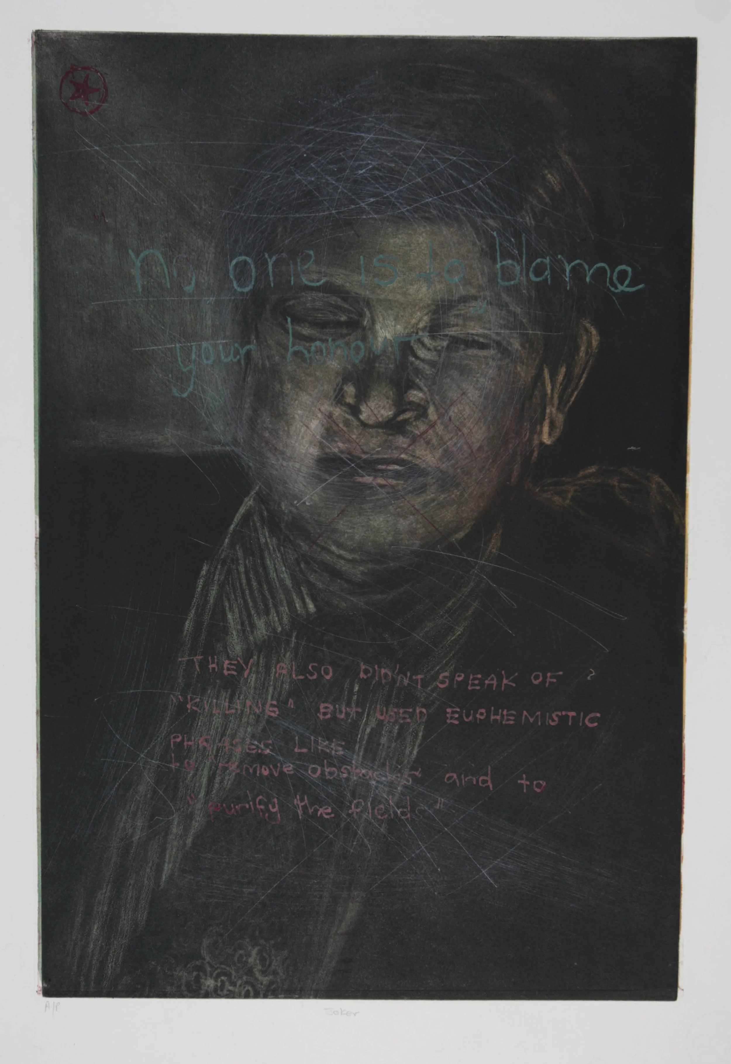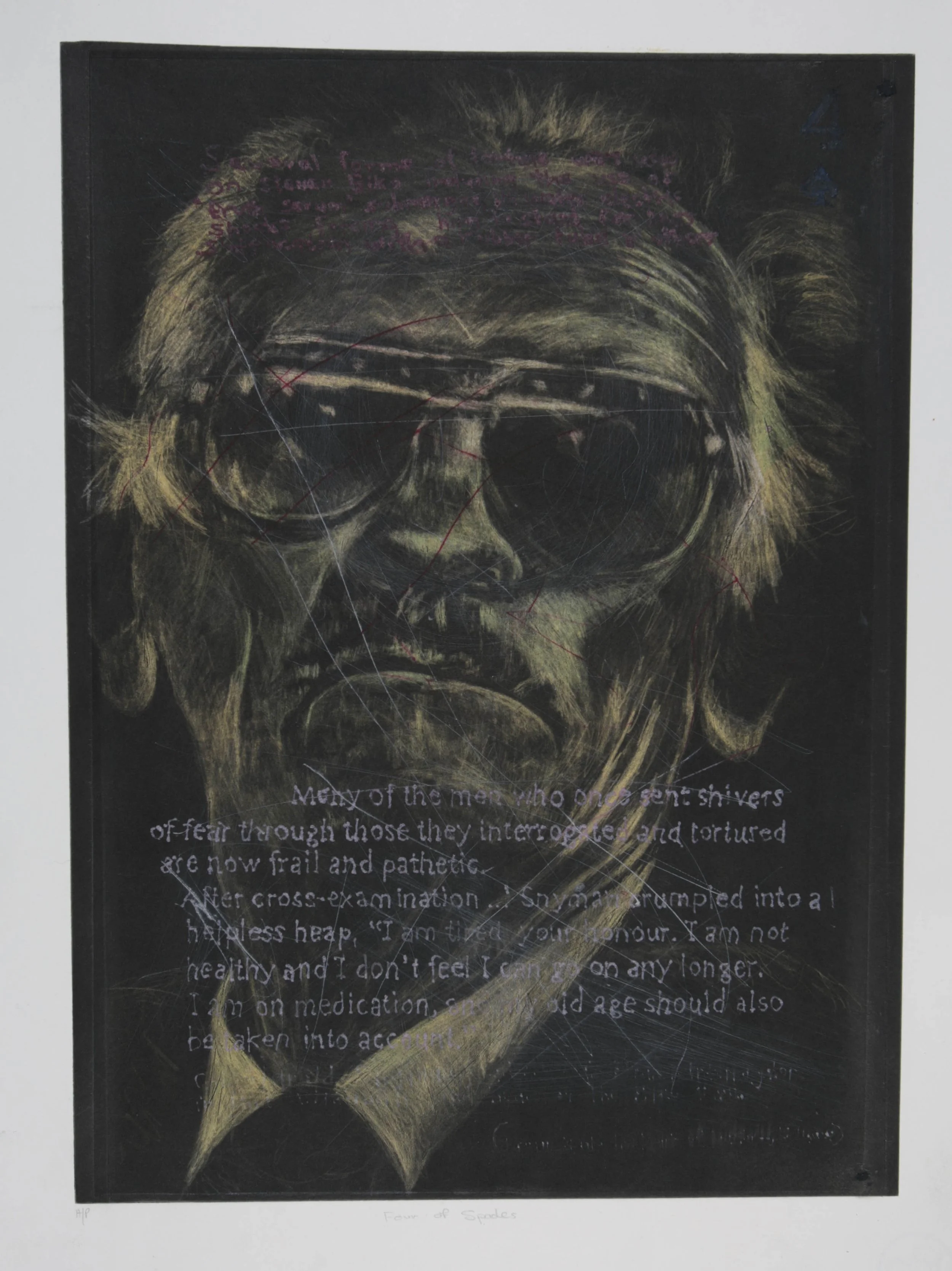I added layers onto the images, first tinting them with a toxic colour, and then aggressively scratching and scribbling over the finely worked surfaces with a sharp tool, and another layer was added to the delicately worked portraits with fragments of texts from their victims. The process represented my attempt to seek my own reconciliation with the TRC and attempt to let go of the bitterness.