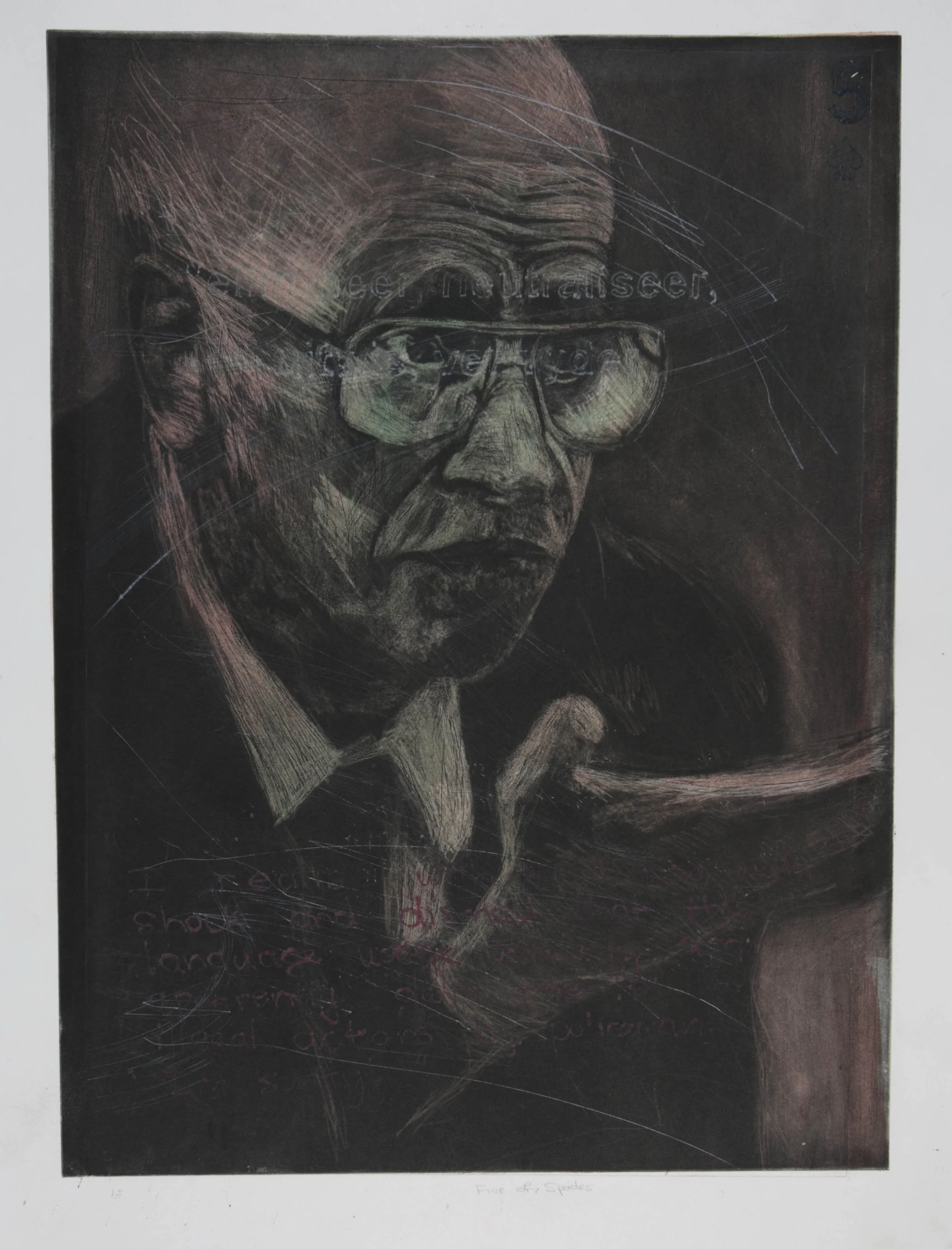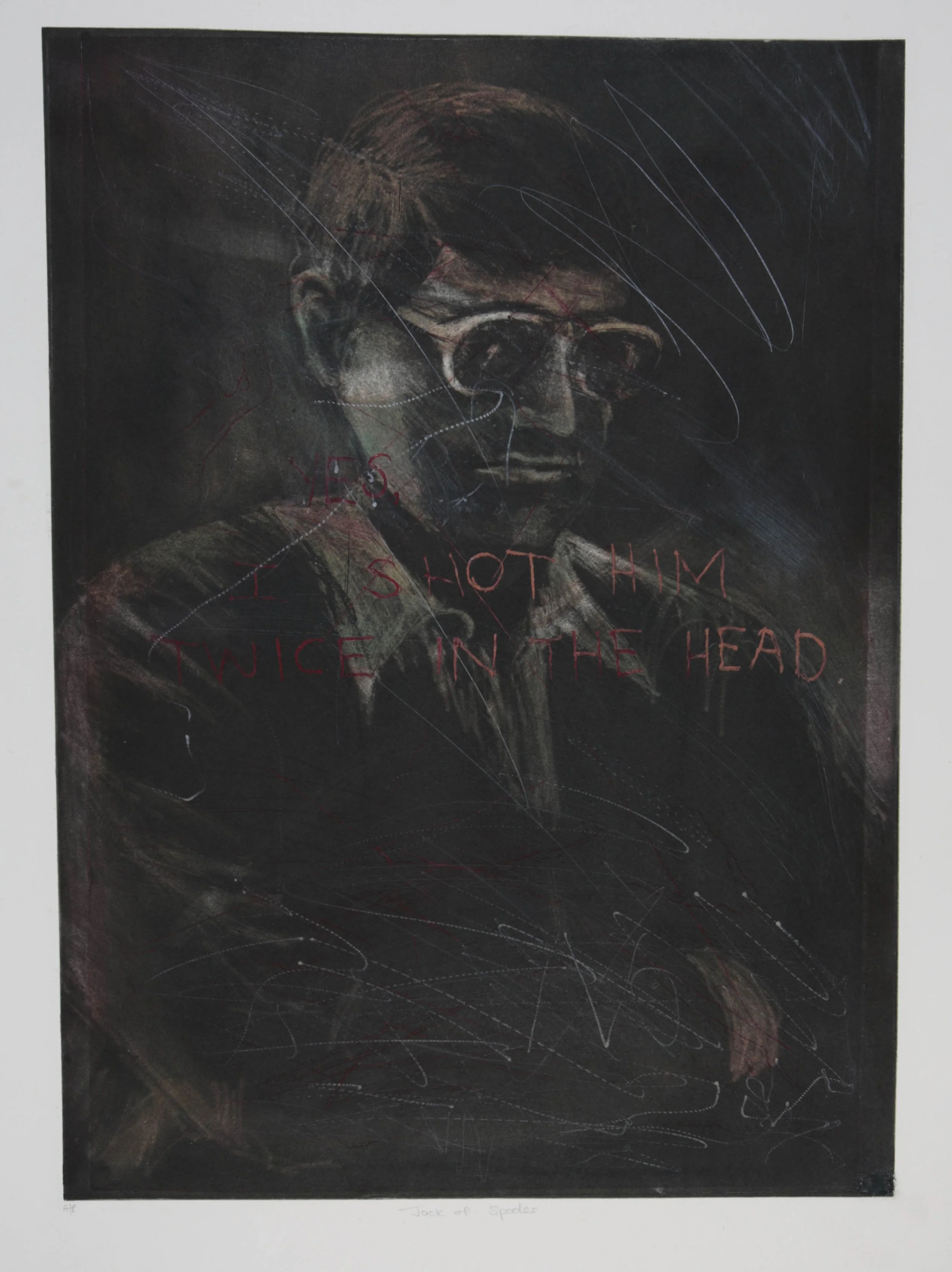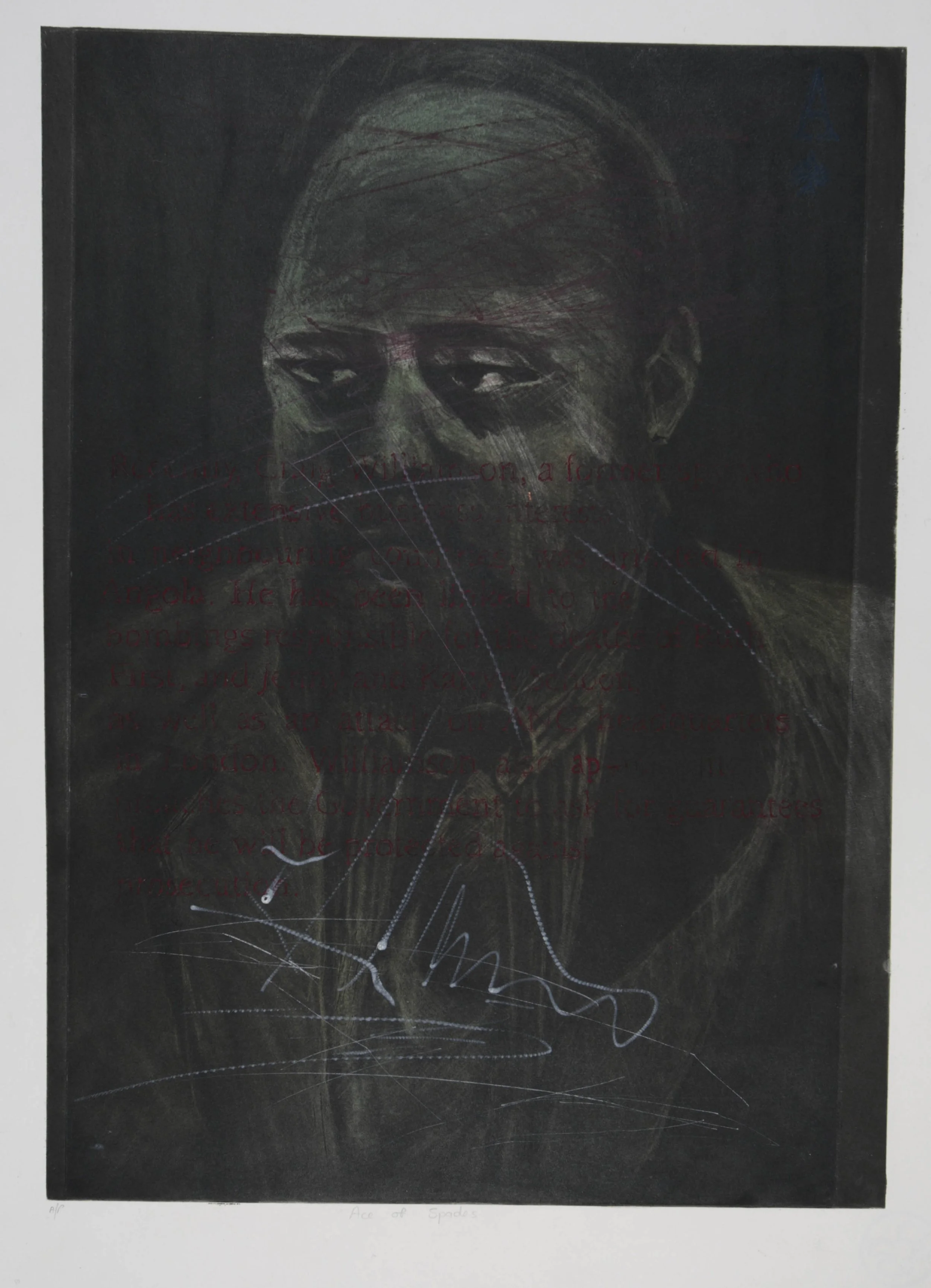 I added layers onto the images, first tinting them with a toxic colour, and then aggressively scratching and scribbling over the finely worked surfaces with a sharp tool, and another layer was added to the delicately worked portraits with fragments of texts from their victims. The process represented my attempt to seek my own reconciliation with the TRC and attempt to let go of the bitterness.