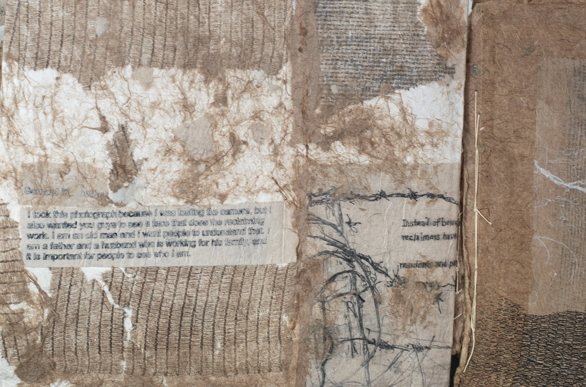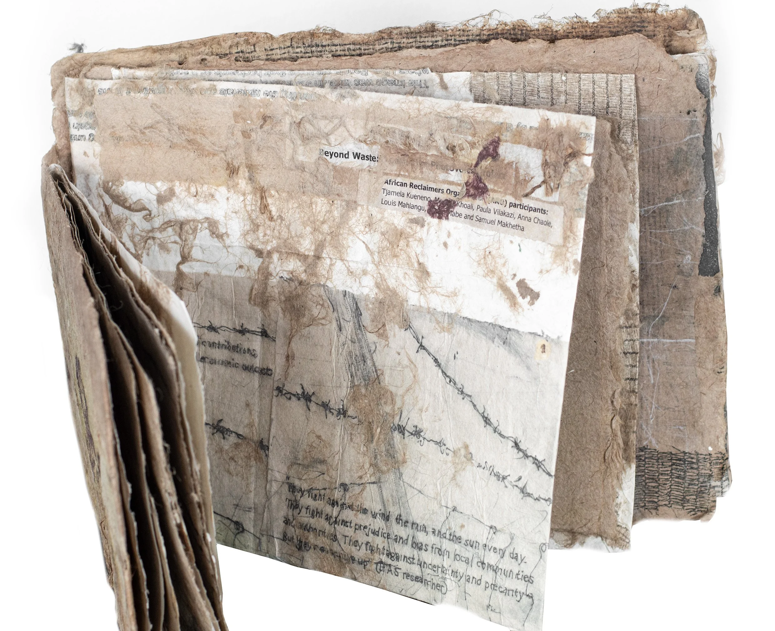 Created in July 2022 for the collaborative Documenta-15 project, this artist’s book is a compilation in three parts. It explores practices of waste reclaiming through collaboration, and the use of reclaimed and invented new materials and combinations. Each section or chapter of the book grapples visually with aspects of the discomfort of these engagements. The artist’s book presents a sticky “compost pile” (Haraway 2016), intended to provoke questions of collaboration and engagement with community.