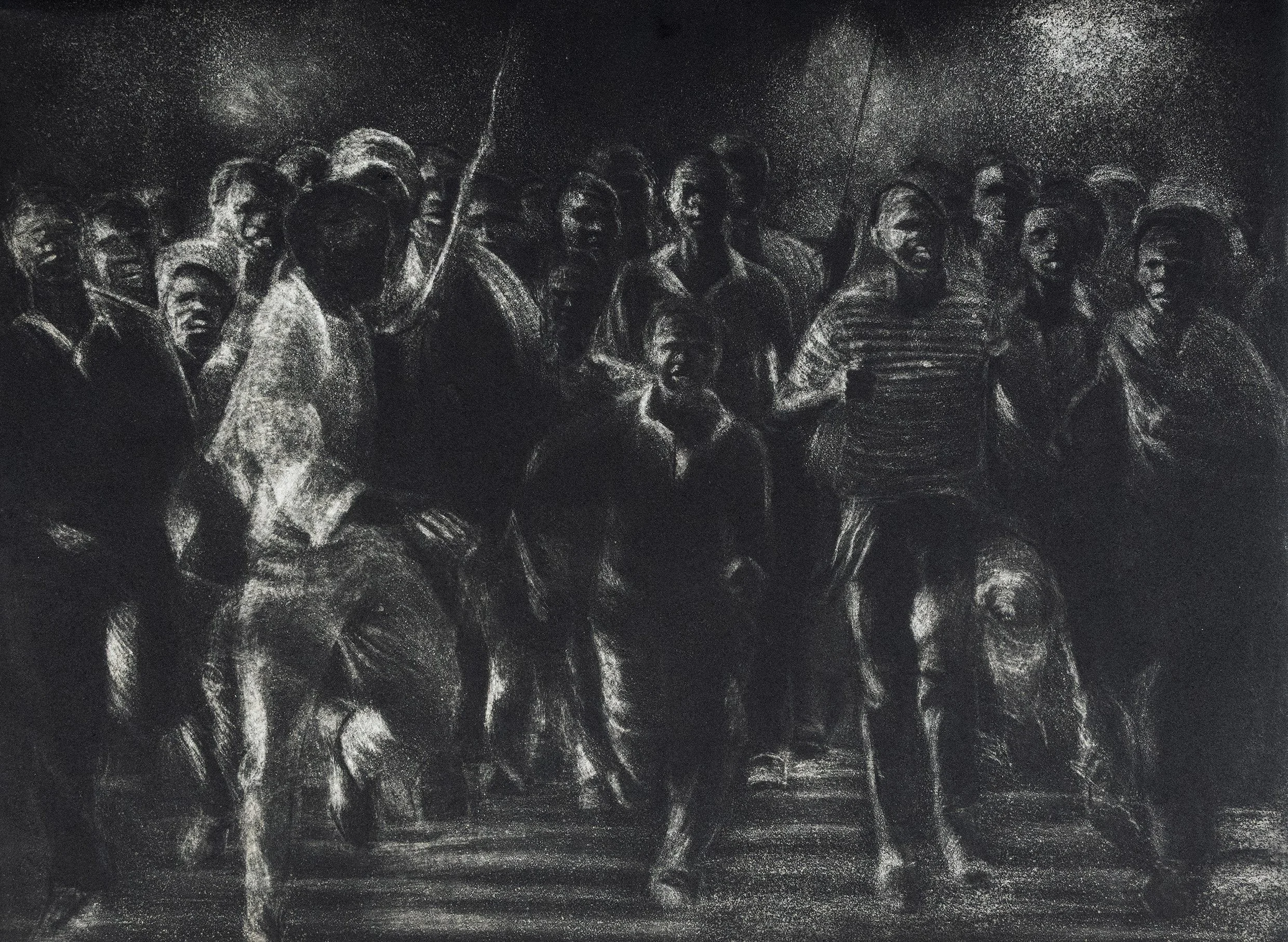 Berman’s political landscapes of this era depict scenes of horror: attacks by right wing vigilantes, police brutality of chasing, sjambokking and teargassing protesters, killing them at random, but also of protesters who, in turn, turning on their torturers, pelted the police and their ominous-looking vehicles with stones, bottles, and the like. She drew her images from photographs from Afrapix - a South African photography collective that was banned in South Africa during the State of Emergency – which were smuggled out the country to Boston.